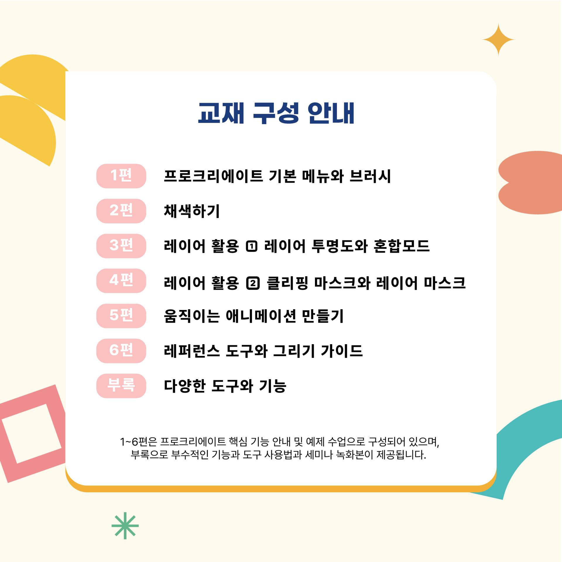 총 6편으로 구성되어 있으며, 디지털 아트에 꼭 필요한 프로크리에이트의 핵심 기능을 단계별로 자세하게 익힐 수 있도록 구성되었습니다.