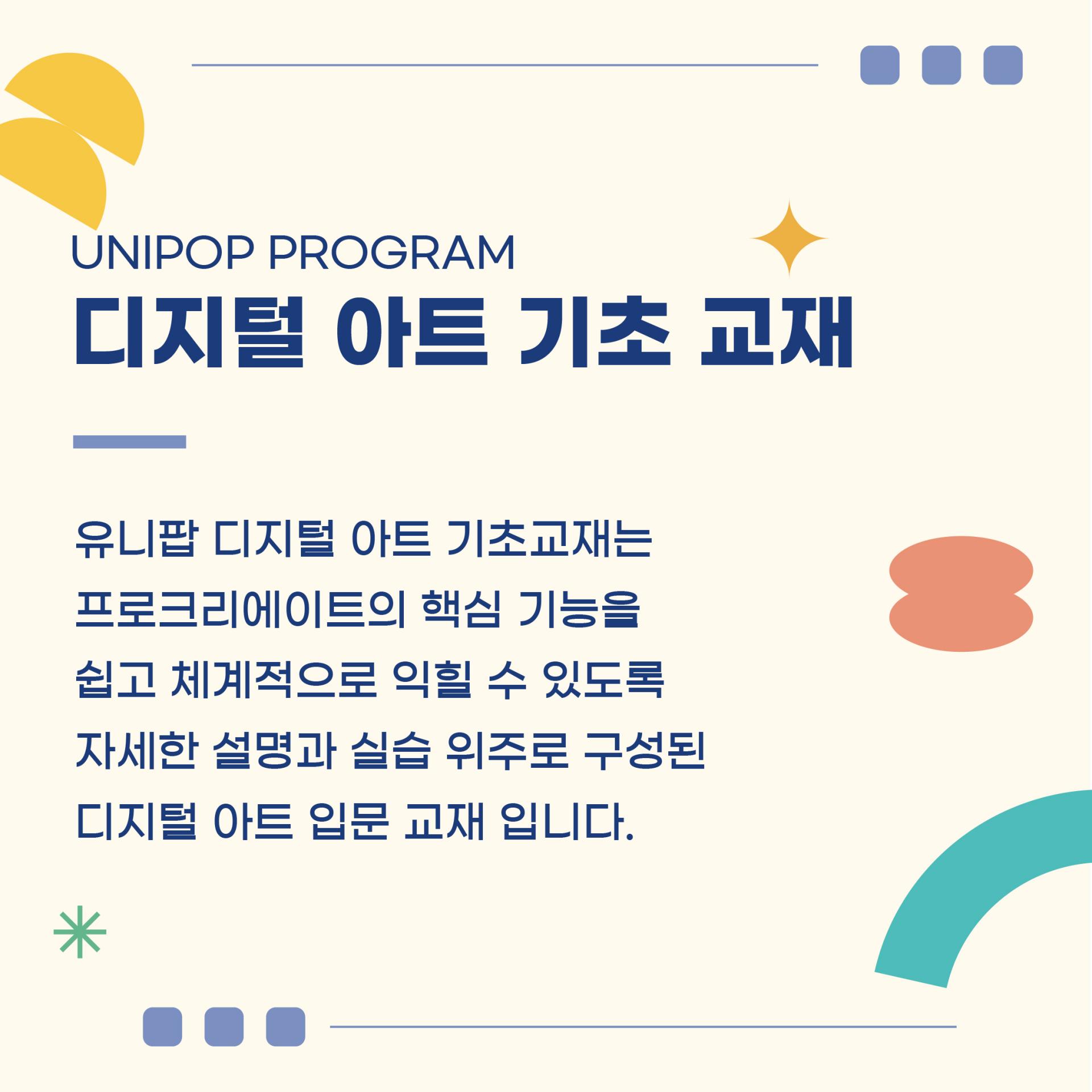 본 교재는 디지털 아트에 대한 이해를 높이고, 변화하는 미래 교육 트렌드에 맞춰 한 단계 더 성장할 수 있도록 기획된 디지털 아트 기초 교재 입니다.
